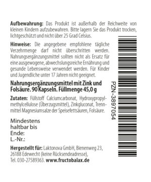 Zutaten: Füllstoff Calciumcarbonat, Zinkglukonat, Hydroxypropylmethylcellulose, Trennmittel Magnesiumsalze der Speisefettsäuren, Folsäure