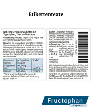 Zutaten: L-Tryptophan, Kapselhülle: Hydroxypropylmethylcellulose, Zinkcitrat, Trennmittel Magnesiumsalze der Speisefettsäuren; Siliciumdioxid, Pteroylmonoglutaminsäure.